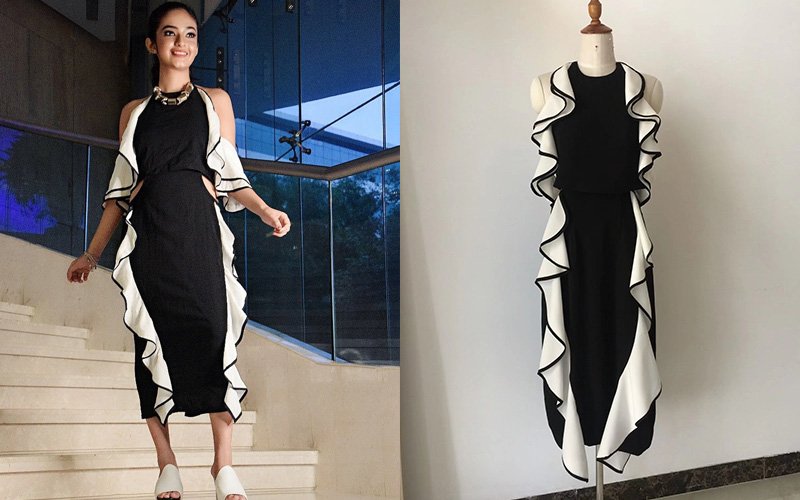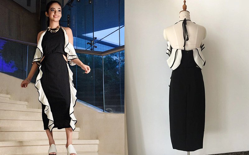Bespoke black midi dress with cascading white ruffles & side cut-out | Dramatic halter neck, perfect fit & statement elegance in one custom piece.