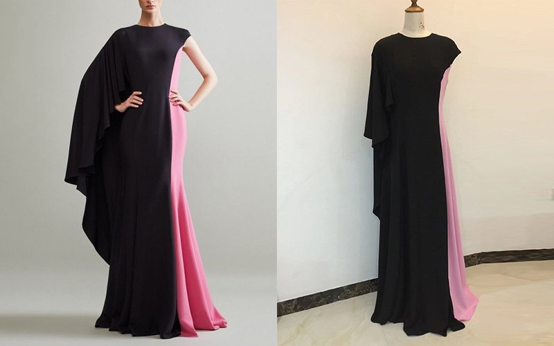 Every proportion was meticulously customized through multiple fittings: shoulder width, cape drape length and volume, neckline depth, waist placement, color-block seam placement, skirt flare, and overall hem length were adjusted to her exact body measurements and posture. The result is a gown that feels both powerful and feminine — perfect for red-carpet events, galas, formal weddings, or any occasion where you want to command attention with quiet drama and modern sophistication. The high-contrast black-and-pink palette photographs beautifully under any lighting and creates an instantly iconic look.True bespoke means this piece exists only for her: we hand-selected the fabric, precisely cut and matched the color panels, and constructed it layer by layer so it becomes a one-of-a-kind wearable work of art.