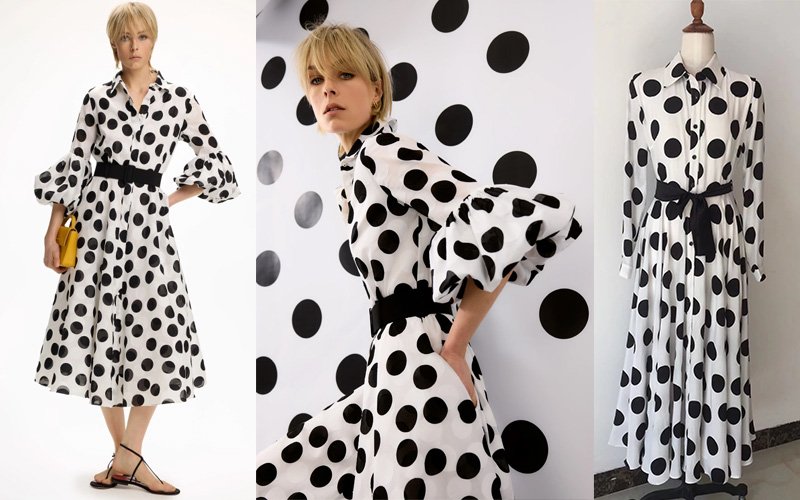 Every proportion was meticulously customized through multiple fittings: sleeve volume and length, shoulder placement, collar height, waist suppression, skirt length, and overall fit were adjusted to her exact body measurements and posture. The result is a dress that feels both playful and sophisticated — perfect for brunch, gallery openings, weekend getaways, or any occasion where you want to make a graphic, confident statement. The high-contrast polka dots photograph beautifully in any light, while the balloon sleeves add modern drama without overwhelming the silhouette.True bespoke means this piece is one-of-a-kind: we source the fabric, hand-cut every panel, and construct it stitch by stitch so it fits and moves like it was made exclusively for her — no ready-to-wear sizing or compromises.