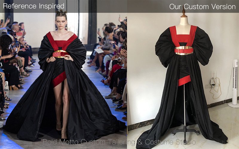 This custom black and red runway gown was developed based on a client-provided reference image, inspired by high-fashion runway designs.